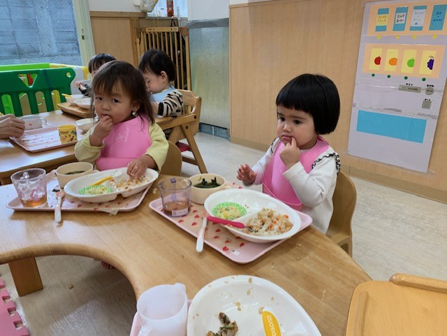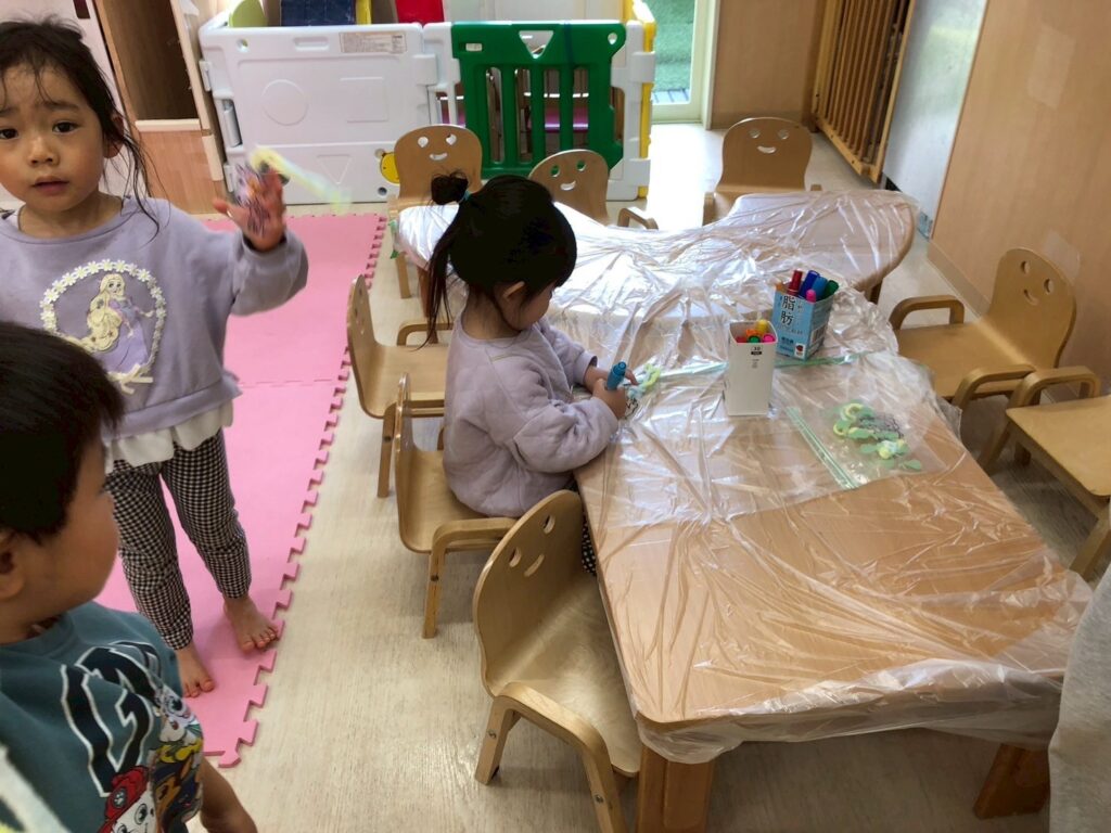 ★食育(2025.10.6) 今日はお月見です🌕✨パン粉でお団子づくりをしました🍡 パン粉はさらさらザラザラしてるね! パン粉にお水を入れるよ もみもみしてみよう✊ パン粉のいい匂いがしてきたね☺ 感触が変わってきたネ! 丸めてお団子を作ってみよう できたらお盆にくださーい😃 みんなで作ったお団子をお盆に盛り🎶でーたでーたぁ月が~まーるいまーるいまんまるい🌕♪と歌って飾りました(*’▽’) その晩きれいなお月様が見れました🌕✨