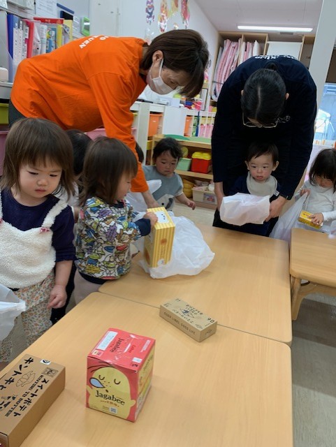 ★食育(2025.8.28) テーマ『とうもろこしの皮むき』 イチゴちゃんがやってきて、みんなにとうもろこしをプレゼント🌽 とうもろこしの ヒゲの数と粒の数は同じなんだって!買う時は是非ヒゲが多いとうもろこしを選んでネ🌽☆ 皮付きのとうもろこしを見て、なにこれ~いつものコーンじゃない~😣と、触るのをためらったり、いきなり持ってみたりと様々な様子の子ども達😊 イチゴちゃんと一緒にゆっくりと触ったり、むいたり☺ だんだん皮付きとうもろこしを力強くむけるようになりました! おひげ~😃 粒が出てきたよー! やったー!きれいにむけたよー🙌 むいた、とうもろこしは、自分でスーパーの袋に入れて持って帰りました☺ お家で美味しく食べてねー🎵🌽 ☘ 苦情 ・ 相談報告 令和7年8月の苦情・相談等はございませんでした。