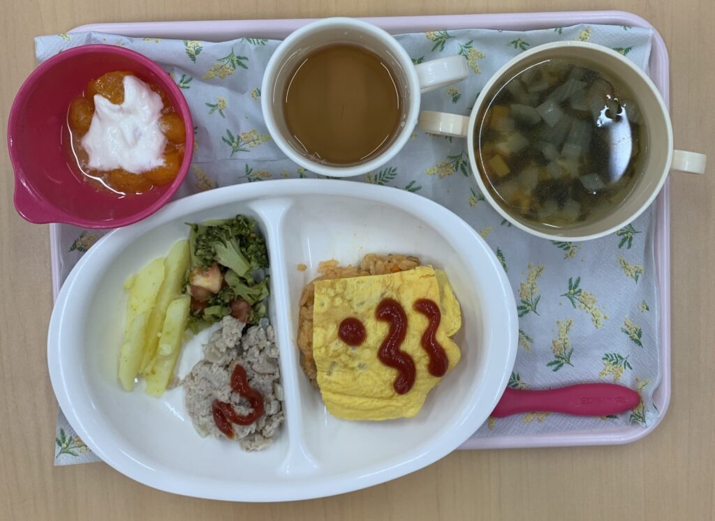 こいのぼりのとうもろこし御飯、七夕バーグ、フライドポテト、茹でブロッコリー、スープ(豆腐)、みかん
