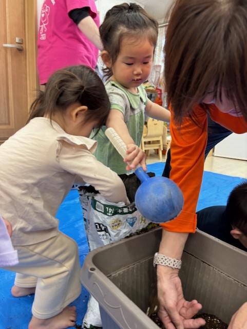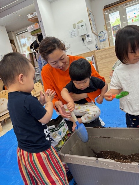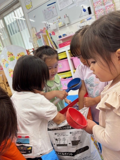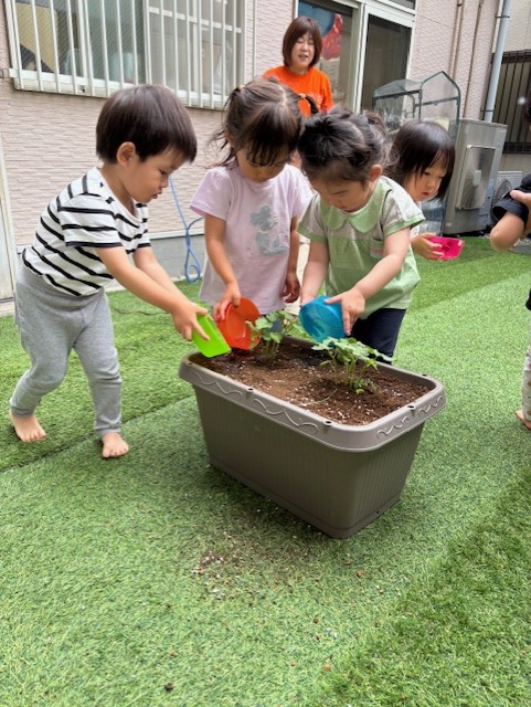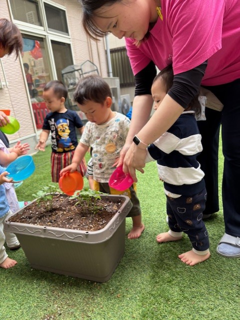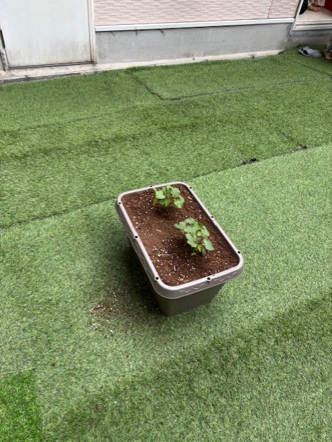 みんなで植えたオクラは、太陽がいっぱい降り注ぐテラスに置きました🌞